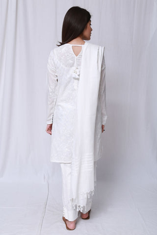 Embroidered shirt with back V-neckline and dorri details. Paired with screen-printed, straight fit trousers and a jacquard dupatta.