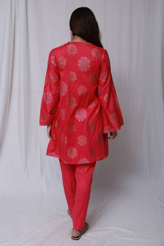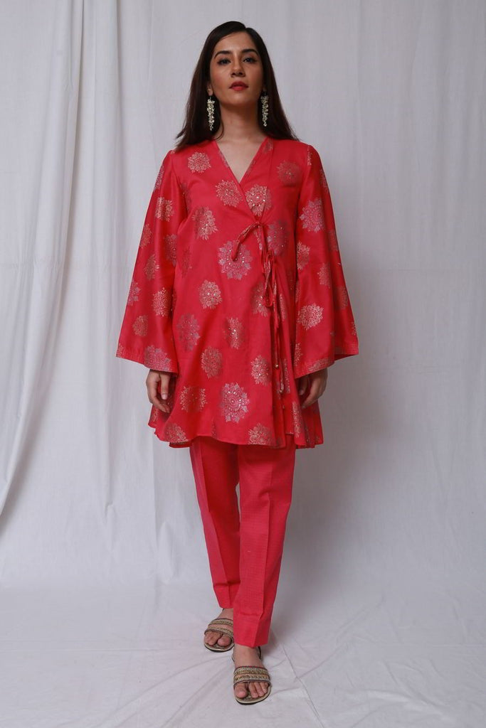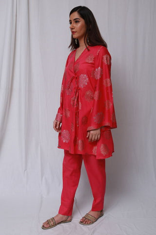 Over-lapped, flared shirt with dorri tie closure. Paired with straight fit, co-ordinating trousers.Fabric: JacquardSleeve Length: FullShirt Length: MediumColour: Pink
