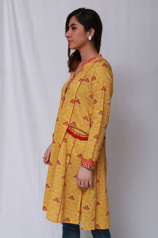 Kurta with side panels and front pockets, accentuated with borders and piping.