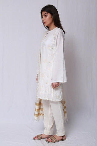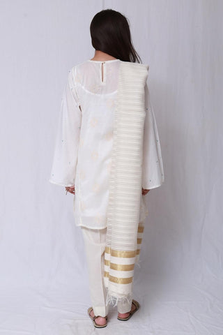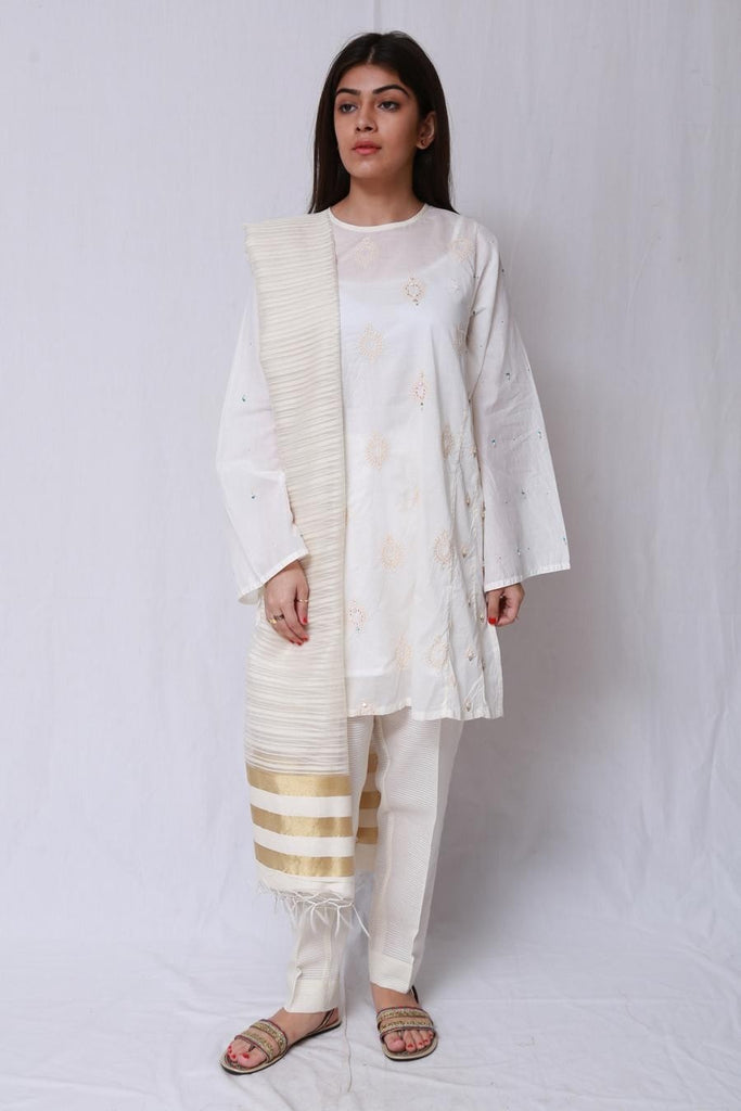 Embroidered Kurta With Sequins And Pearls Embellishment. Paired With Straight Fit Trousers And A Striped Doria Dupatta.
