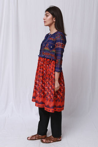 Print blocked, flared tunic with tassel details on yoke and waistline.