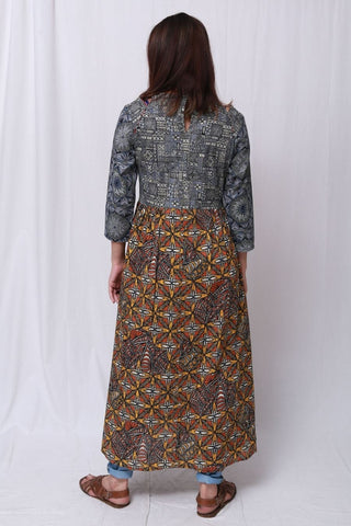 Print-blocked frock with Maharaja neckline and aari work on front.