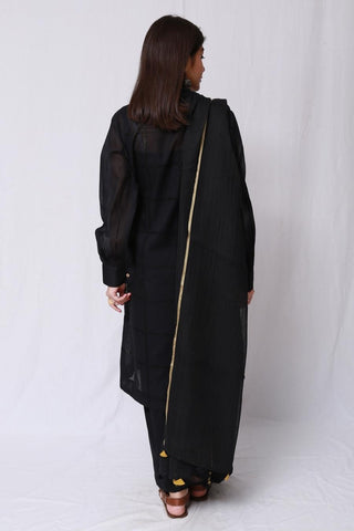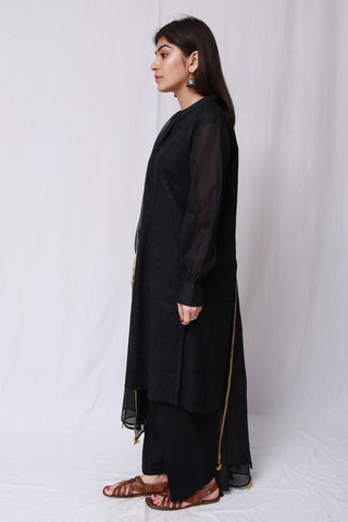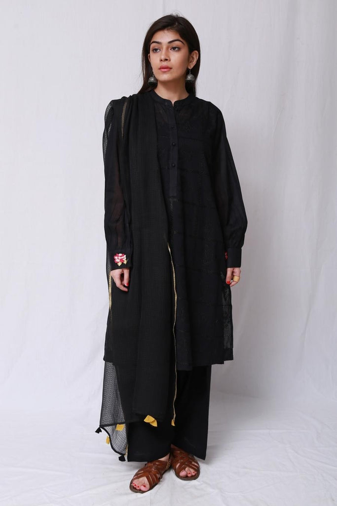 Kurta In Tarkashee Inspired Shifley Fabric With A Collar And A Cross-Stitch Embroidered Motif On Cuffed Sleeves. Paired With A Co-Ordinating Dupatta And Classic Fit Shalwar.